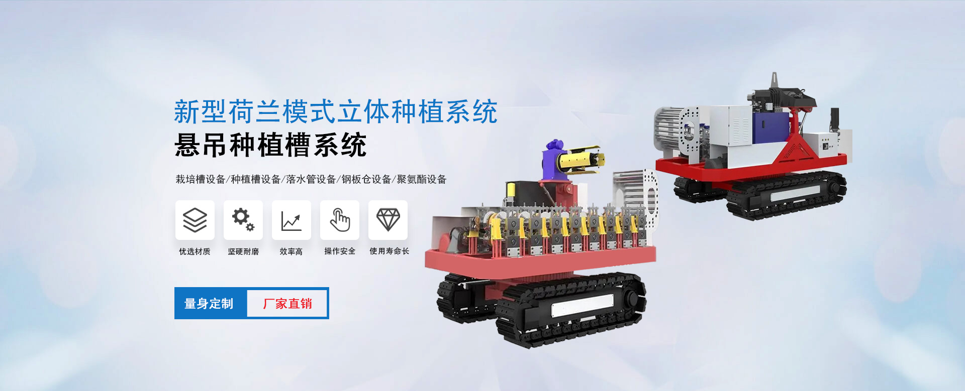 雄博機械主營:種植槽設(shè)備/栽培槽設(shè)備/草莓栽培槽/新型立體種植槽/草莓無土栽培設(shè)備/草莓立體種植系統(tǒng)/懸吊種植槽系統(tǒng)/落水管設(shè)備/鋼板倉設(shè)備/聚氨酯設(shè)備等。