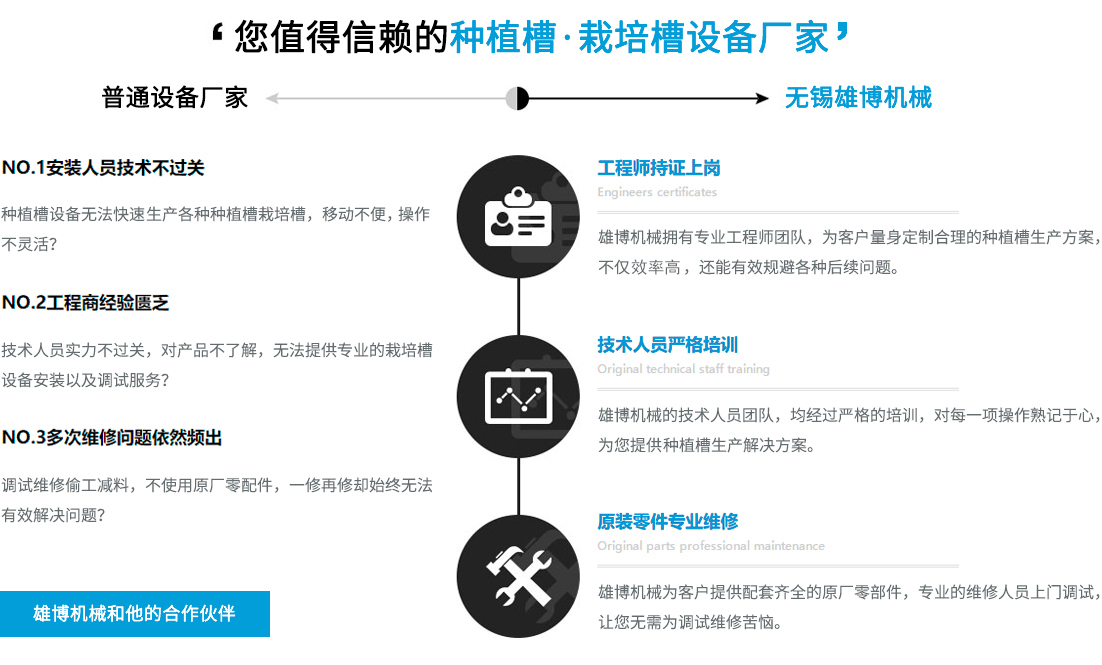您在選擇雄博產(chǎn)品的同時,也選擇無微不至的終身服務(wù)。可根據(jù)不同客戶實際需求進行種植槽設(shè)備,栽培槽設(shè)備等的特殊工藝設(shè)計制造專業(yè)一對一售前/售后/技術(shù)咨詢指導(dǎo),享受更貼心/放心的設(shè)備使用體驗。